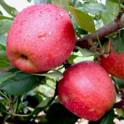 Especially fine red dessert apple derived from Jonathan. Sweet, rich, spicy flavor, well regarded by apple connoisseurs. Resists scab and powdery mildew. Harvest in early season (August in Central California). 800 hours. Pollenizer required: Fuji, Gala, Granny Smith, Golden Delicious. USDA Zones 5-9.