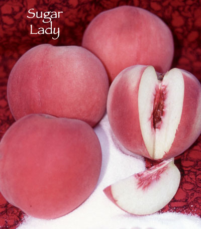 Among the best of the low acid/high sugar white peaches - a farmer's market favorite. Red-skinned fruits are medium to large, very firm, freestone. Introduced in 1986. 800 hours. Self-fruitful. (Zaiger)