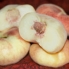 Medium size, saucer style peach with white flesh swirled red. Skin is tinted pink to dark red. Fruit is quite ornamental hanging in the tree. Harvest mid to late May. 400 hours. Self-fruitful. (Zaiger)